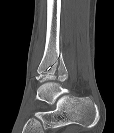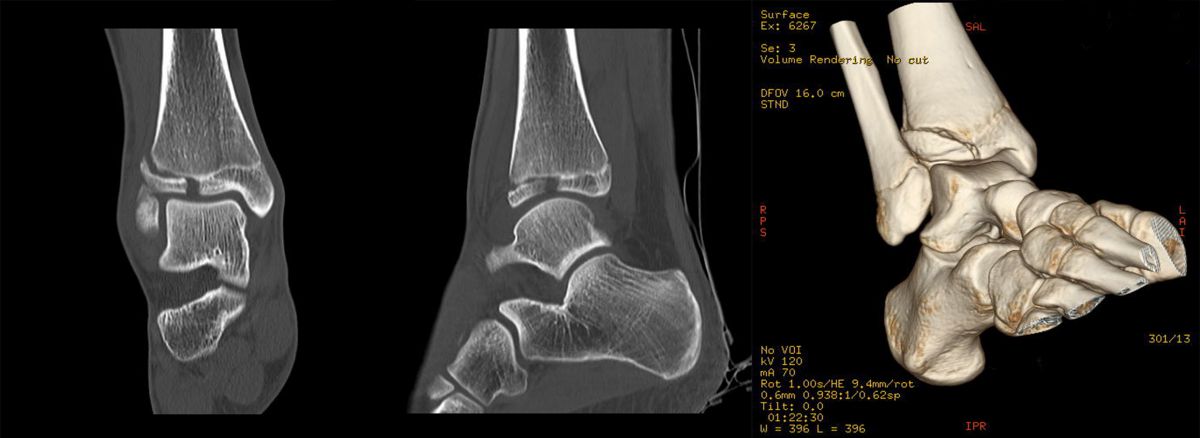 Der teilweise komplexe Frakturverlauf bei Übergangsfrakturen lässt sich im CT zuverlässig darstellen 10. Der erfahrene Untersucher kann bereits mit Röntgenaufnahmen des Sprunggelenks in zwei Ebenen in Verbindung mit zwei 45° Schrägaufnahmen sehr umfassende Aussagen zum Frakturverlauf treffen (v. Laer 2013), die Präzision und Aussagekraft der Computertomografie ist aber zweifelsohne überlegen und wird von den meisten Behandlern bevorzugt 11, auch wenn sich zu diesem Thema in der Literatur eine teilweise sehr emotional geführte Diskussion findet. Einigkeit hinsichtlich der Indikation für ein Schnittbildverfahren besteht bei Triplane-Frakturen, wenn Zweifel darüber bestehen, inwieweit die metaphysäre Fraktur den tragenden Gelenkanteil tangiert 12.