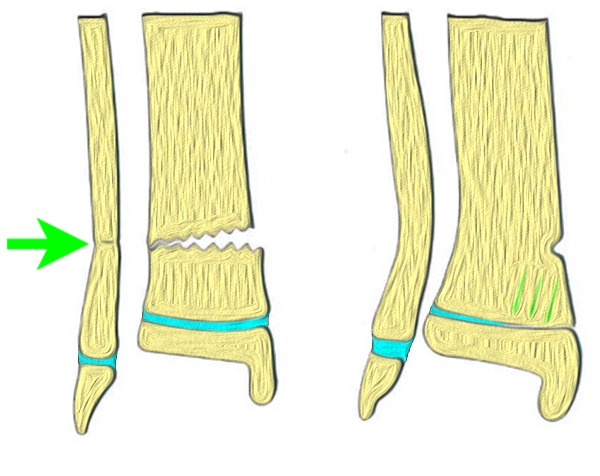 An der distalen Tibiametaphyse können Stauchungsbrüche, metaphysäre Biegungsbrüche vollständige Frakturen sowie Fugenschaftfrakturen unterschieden werden.