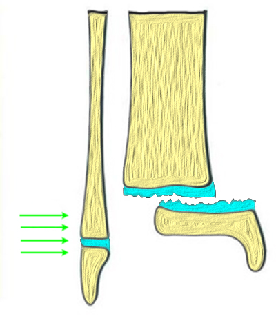 Ein Trauma in der Verschlussphase der Wachstumsfuge beschleunigt den Fugenschluss. Das vorzeitige Ausreifen der Fuge zieht eine geringgradige Verkürzung des betroffenen Skelettabschnitts nach sich.