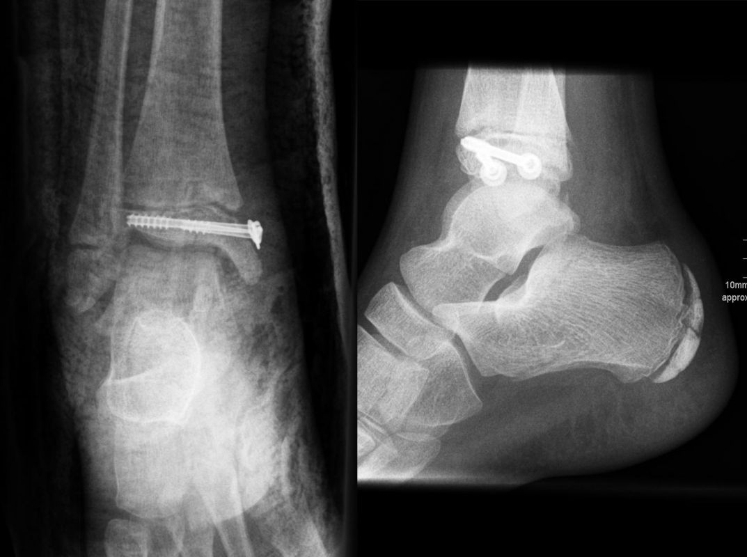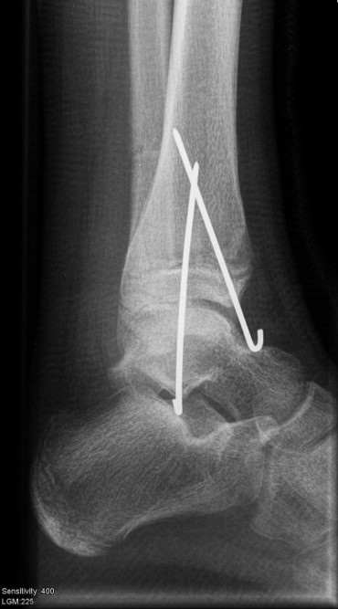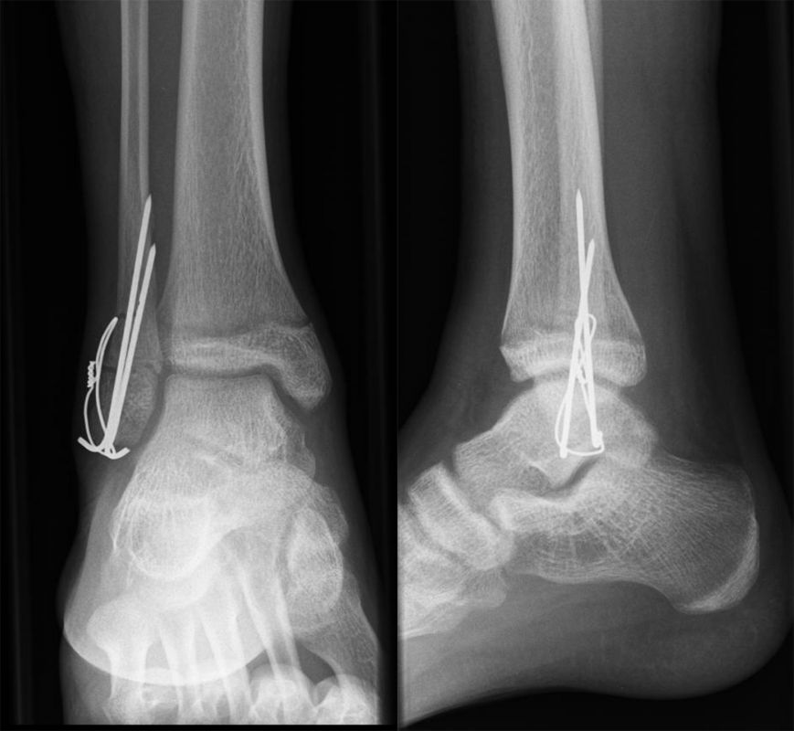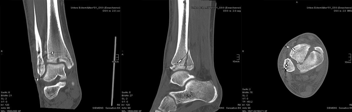 Nach Gipsabnahme können die Drähte entfernt und das Sprunggelenk zunehmend aufbelastet werden.
