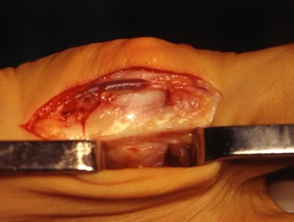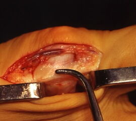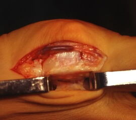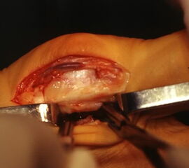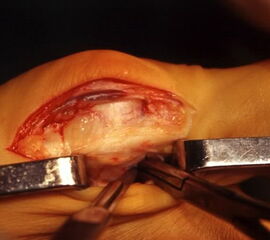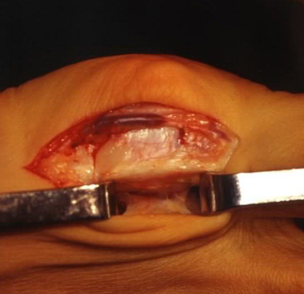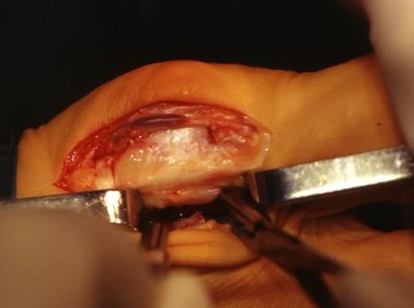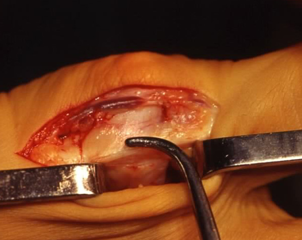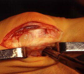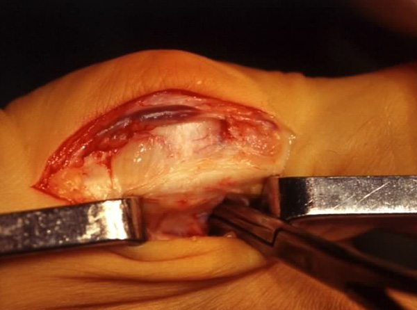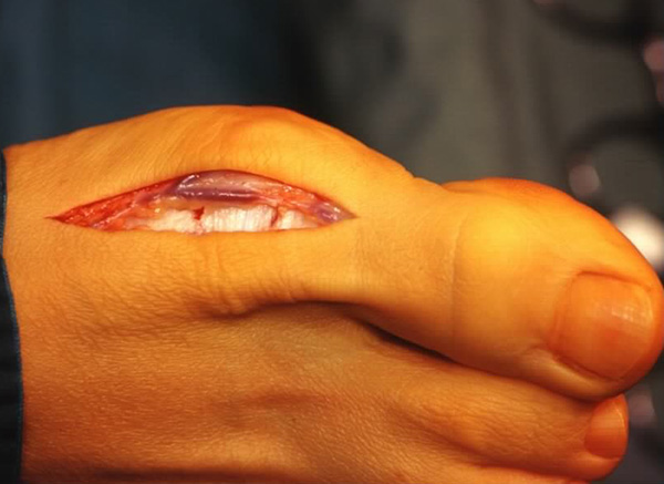 Die laterale Gelenkskapsel wird dargestellt, das in der Tiefe gelegene Lig. intermetatarseum transversum prof. wird auf jeden Fall geschont. Durch Manipulation der Großzehe in Extension und Flexion kann der Gelenkspalt von außen identifiziert werden, die Gelenkskapsel wird nun unter querer Durchtrennung des Lig. collaterale lat. eröffnet: die Inzision reicht dorsalseitig vom lateralen Rand des M. ext. hall. brev. nach plantar bis zum lateralen Rand des Lig. sesamophalangeale lat. Eine rechtwinklige Präparierklemme wird in das Gelenk unter das Lig. metatarsosesamoidale lat. eingeführt und damit das Lig. metatarsosesamoidale lat. ohne Gefahr einer Gefäßläsion komplett durchtrennt.