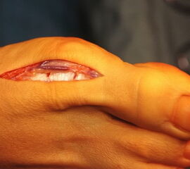 bei Zugang über eine einzelne dorsomedial gelegene Hautinzision (Abbildung 3) wird stumpf mit Scherenschlägen direkt über den Strecksehnen nach lateral, und lateral der Strecksehnen nach intermetatarsal präpariert (Abbildung 4). Mit je einem Scherenschlag distal und einem proximal des Gelenkspaltes wird Platz für 2 Haken geschaffen, wobei sich Farabeuf-Haken bewährt haben (Abbildung 5). Dabei wird das subcutane Gewebe komplett nach lateral verschoben, was im Gegensatz zum Zugang über einen eigenen intermetatarsalen Hautschnitt eine deutlich bessere Übersicht über den ersten Intermetatarsal-Raum gibt. Die laterale Gelenkskapsel wird dargestellt, das in der Tiefe gelegene Lig. intermetatarseum transversum prof. wird auf jeden Fall geschont (Abbildung 6). Durch Manipulation der Großzehe in Extension und Flexion kann der Gelenkspalt von außen identifiziert werden, die Gelenkskapsel wird nun unter querer Durchtrennung des Lig. collaterale lat. eröffnet (Video 3): die Inzision reicht dorsalseitig vom lateralen Rand des M. ext. hall. brev. nach plantar bis zum lateralen Rand des Lig. sesamophalangeale lat. (Abbildungen 7 und 8). Nun wird versucht, durch die Inzision eine rechtwinklige Präparierklemme in das Gelenk unter das Lig. metatarsosesamoidale lat. einzuführen (Abbildungen 9 und 10): wenn dies gelingt, kann direkt über der Präparierklemme das Lig. metatarsosesamoidale lat. ohne Gefahr einer Gefäßläsion komplett durchtrennt werden (Abbildungen 11 und 12). In Fällen stärkerer degenerativer Veränderungen oder postentzündlicher Verwachsungen gelingt das Einführen der Präparierklemme in das Gelenk meist nicht, in diesen Fällen muss das Lig. metatarsosesamoidale lat. unter Sicht von der Lateralseite des MTK-1 abgelöst werden. Das komplette laterale Release wird einerseits durch das lockere Einführen eines stumpfen Hohmann-Hebels zwischen Plantarseite des MTK-1 und Sesambeinkomplex geprüft, andererseits durch Varisierung der Großzehe. Gelingt dies nicht, so ist in erster Linie zu prüfen, ob das Lig. metatarsosesamoidale lat. komplett durchtrennt wurde, in zweiter Linie müssen alle anderen Strukturen, die eventuell im Einzelfall noch für eine laterale Kontraktur am Großzehengrundgelenk verantwortlich sein können, visuell und durch Nachtasten geprüft werden: Ansatz des M. adductor hallucis an der Basis der Grundphalanx, hochgradige Kontraktur des Lig. sesamophalangeale lat.