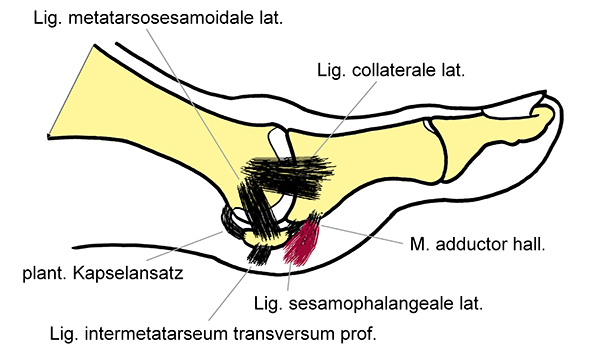 - das laterale Seitenband (Lig. collaterale lat.) stellt eine ligamentäre Verstärkung der Gelenkskapsel vom Tuberculum lat. des ersten Metatarsalköpfchens (MTK) zum Tuberculum lat. der Basis der proximalen Phalanx dar