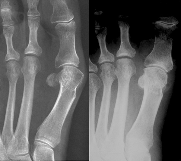 Neben diesen degenerativen Veränderungen der Weichteile im Rahmen der Hallux valgus-Entwicklung erscheinen knöcherne Veränderungen am 1. Strahl von geringerer Bedeutung und sind im allgemeinen degenerativer Natur als Folge oder als altersentsprechende Begleiterscheinung der Fehlstellung: Degeneration im 1. MTP-Gelenk in Folge der Hallux valgus-Fehlstellung, Degeneration des 1. Tarsometatarsalgelenkes als Folge einer Instabilität oder im speziellen auch Degeneration/Deformation der Gelenksfläche zwischen der Plantarseite des MTK-1 und dem Sesambeinapparat.