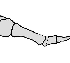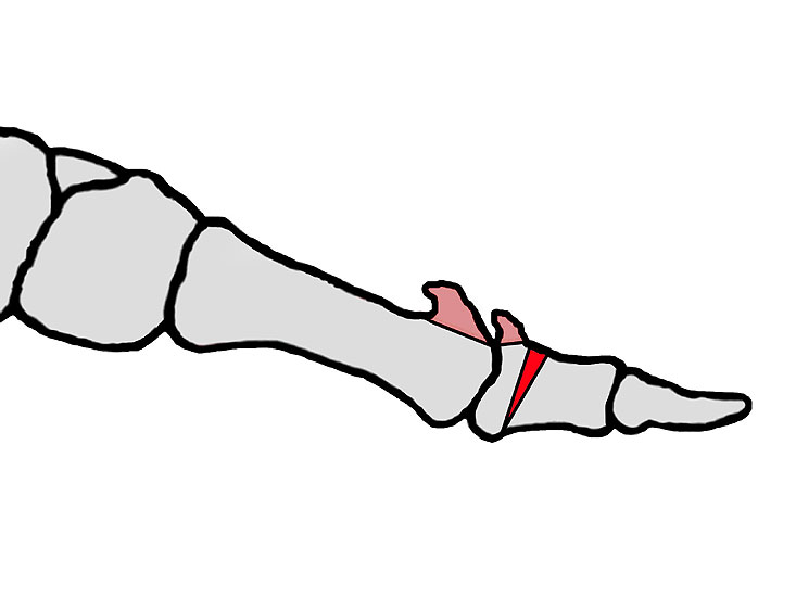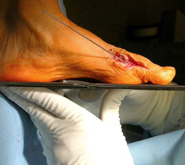 Die Osteotomie kommt als dorsal zuklappende, basis- und gelenksnahe Prozedur am Großzehengrundglied zur Anwendung (Moberg Osteotomie)14. Sie soll einen funktionellen Transfer von der Plantarflexion in die Dorsalflexion ermöglichen. Ziel ist eine Pseudo-Dorsalflexion der Großzehe mit weniger Stoßentwicklung auf das Großzehengrundgelenk in der Abschlussphase des Gehens. Wird diese Technik gewählt, muss die Plantarflexion am Großzehengrundgelenk möglich sein. Bei der Modifikation mit zusätzlicher Verkürzung kommt es zu einer deutlichen Entspannung im Gelenk. Die Osteotomie nach Moberg kann mit der Cheilektomie kombiniert werden 27(Abb. 5, 6) und entspricht dem operativen Vorgehen nach Kessel- Bonney.