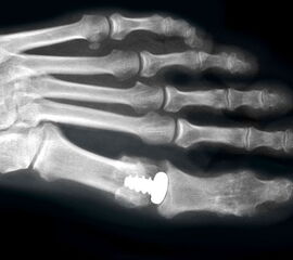 Der Grund für die hohe Komplikationsrate (Schmerzen, Bewegungsverlust, Fehlstellungen, Prothesenlockerungen) 59 bei der Prothetik am Großzehengrundgelenk ist nicht gänzlich geklärt. Neben materialtechnischen Faktoren (z.B. Ermüdungsfrakturen bei Silikonimplantaten, Lyse durch Silikonpartikel) oder Problemen an Kontaktflächen (Zystenbildung) spielen biologische und chirurgisch-technische Faktoren eine Rolle. Oft resultiert trotz intraoperativ tadelloser Beweglichkeit ein dramatischer Verlust an Beweglichkeit im Rahmen der postoperativen Fibrose oder wegen periprothetischen Exostosen. Chirurgische Faktoren sind: ungenügende Korrektur des intermetatarsalen Winkels I/II beim Hallux valgus, Verletzungen von Bändern und Sehnen am Großzehengrundgelenk, schlechte Balancierung der Weichteile mit asymmetrischen Sehnen- und Bandzügen, mangelhafte Verankerung der Implantate und schlechte kortikale Abstützung, low grade-Infektion, schlechte Patientenselektion. Die Rückzugsmöglichkeit ist die Prothesenentfernung mit anschliessender Interpositionsarthroplastik, meist mit einem trikortikalen Stück autologem Beckenkamm und Spongiosaplastik.