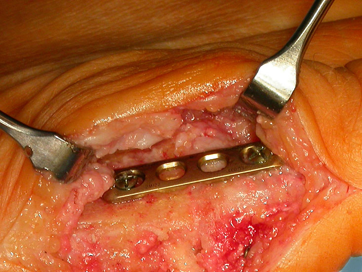 Die Morphologie des Gelenkes ist Grundlage für die Wahl der Operationstechnik (Röntgenbild). Bei flachem Metatarsalekopf erfolgt die Arthrodese über plane Osteotomieflächen (Abb. 7), ansonsten kann mit konkaven (Metatarsalekopf) und konvexen (Grundglied) Fräsen die Gelenkskonfiguration erhalten werden. Die Technik mit den Arthrodeseflächen ist technisch anspruchsvoll (Definition der korrekten Stellung der Großzehe) und resultiert in einer Verkürzung der Großzehe um einige Millimeter. Mit den Fräsen kann wie bei einem Kugelgelenk die optimale Großzehenposition einfach getestet werden ohne dass die Großzehe wesentlich an Länge einbüsst (keine Nachresektion zur Stellungskorrektur nötig).