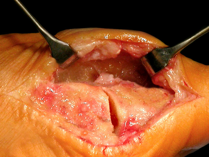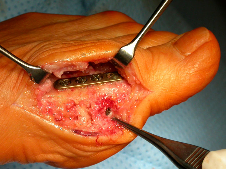 Der Zugang erfolgt längs dorsal am Großzehengrundgelenk, um die Gelenksflächen gut bearbeiten zu können. Das Extensorenretinakulum wird längs medial der Streckersehnen gespalten und die Sehnen nach lateral weggehalten. Dann wird die Kapsel längs eröffnet mit Entfernung der Osteophyten und Exposition der Basis des Grundgelenkes sowie des Metatarsalekopfes. Nun wird ein Führungskirschnerdraht eingebracht und die beiden Gelenksflächen gemäss der Dimension der proximalen Grundgliedbasis konisch gefräst. Dann erfolgt die Entnahme der ipsilateralen M. grazilis- oder M. semitendinosus-Sehne mit dem Sehnenstripper. Das Transplantat wird kugelförmig gerollt, vernäht und in die gefräste Knochenhöhle eingebracht. Anschließend wird das Transplantate an der Kapsel armiert und die Kapsel verschlossen. Bei ungenügender Stabilität der Großzehe kann ein temporärer Kirschnerdraht für 4 Wochen eingebracht werden.