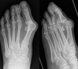 Der Hallux valgus ist durch einen vergrößerten Intermetatarsalwinkel mit dezentrierten Sesambeinen und valgischer Stellung der Großzehe charakterisiert. Oft kommt es zu Druckbeschwerden im Bereich des prominenten Metatarsale I Kopfes. Durch Verlagerung des Drehzentrums kommt es zu einer insuffizienten Kraftaufnahme des ersten Strahls 1, was zu einer Überbelastung der Metatarsale II und III Köpfe führen kann (Transfermetatarsalgie). Bei den meist weiblichen Patienten (Waizy 2015) kann es je nach Ausprägung der Großzehe zur Verdrängung der Kleinzehen und zu komplexen Vorfußfehlstellungen kommen 23.