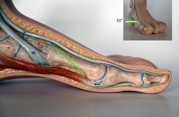 Die Ludloff-Osteotomie verläuft von dorsal-proximal nach distal-plantar und verlässt das Os metatarsale I einige Millimeter proximal des Sesambeingleitlagers. Zur Plantarisierung wird die Schnittebene ca. 10° nach lateral-plantar gekippt.