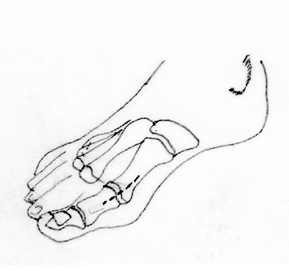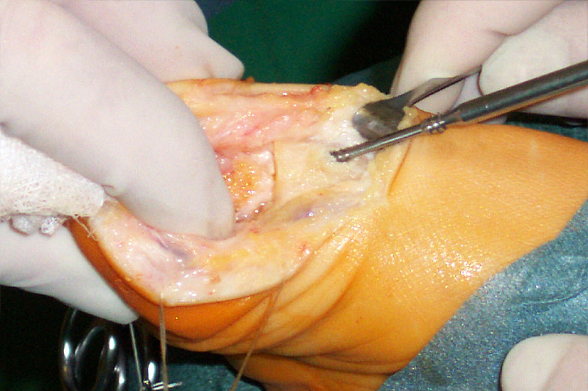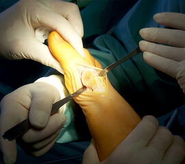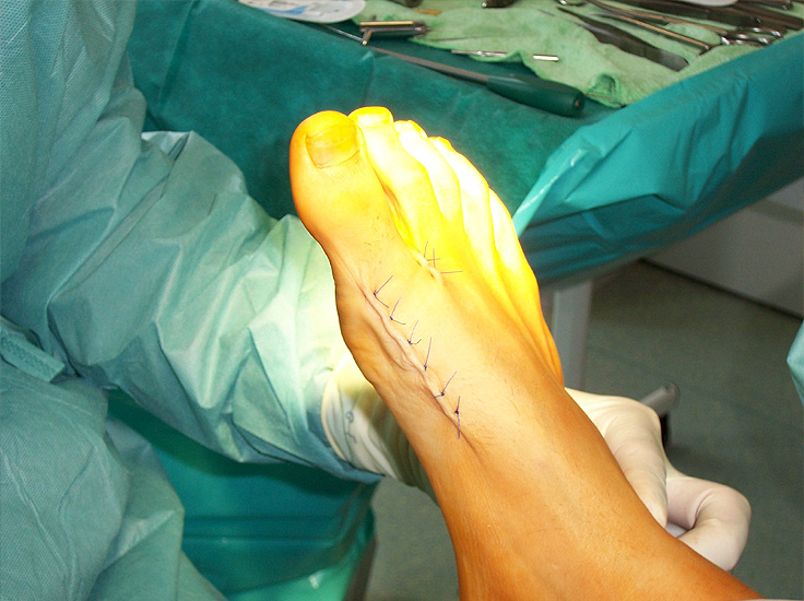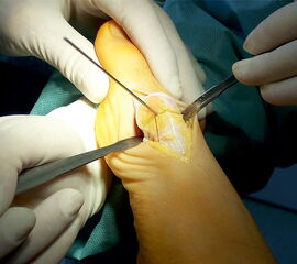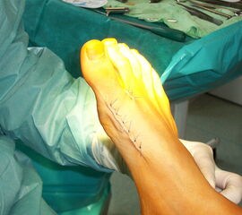 - Sterile Abdeckung des Operationsgebietes unter Einschluß der Ferse. Eventuell Abdeckung der nicht zu operierenden Zehen mit umgewendetem Operationshandschuh und/oder Tape.