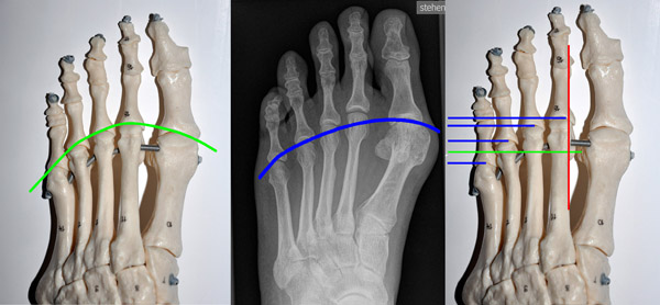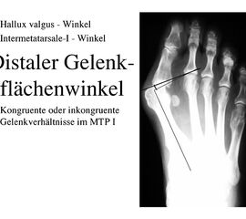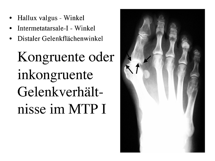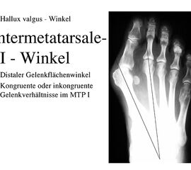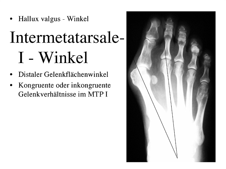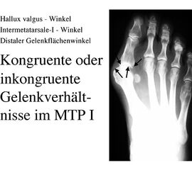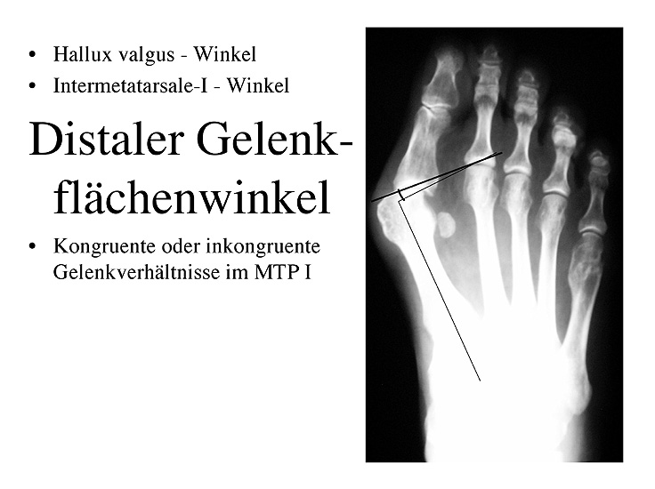 Die Indikationsstellung des geeigneten Operationsverfahrens erfolgt nach dem Schweregrad der Hallux valgus Deformität (Lehmann DE, 2003). Diese kann anhand verschiedener Winkelparameter graduiert werden, nämlich dem Hallux valgus Winkel, dem Intermetatasale – I – Winkel sowie dem distalen Gelenkflächenwinkel, der häufig auch als PASA-Winkel bezeichnet wird (Abb. 1 – 4). Bedeutsam für die Wahl des geeigneten Vorgehens ist auch die Berücksichtigung der Kongruenzsituation der Gelenkpartner im Großzehengrundgelenk, der durch ein entsprechendes Weichteilrelease Rechung getragen werden muß. Nach der Korrektur soll ein harmonisches Vorfußalignement erreicht werden (Abb.5) (Maestro M, 1995, Ludloff K, 1918, Pisani G, 1998).