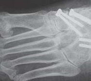 Die Calcaneocuboidal-Arthrodese ist meistens Teil weiterer Arthrodesen im Bereich der Fußwurzel 34 (Abb. 10). Eine besondere Bedeutung kommt der Calcaneocuboidal-Arthrodese bei Eingriffen zur Behandlung des Plattfußes, die der Verlängerung der lateralen Säule dienen, zu 35. Die Arthrodese kann mittels Schrauben, Klammern, Plattensystemen und ggf. der Interposition eines kortikospongiösen Spanes zur Verlängerung der lateralen Säule erfolgen.