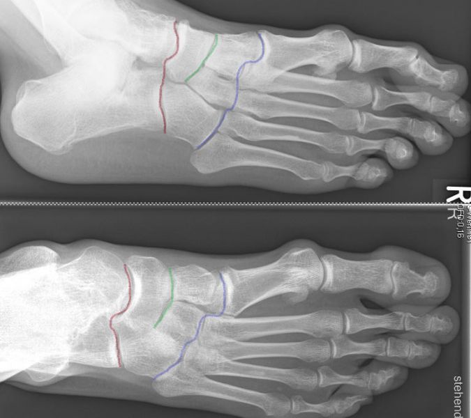 Die Lisfranc-Gelenkreihe wird aus den Ossa cuneiformia/Os cuboideum und den jeweiligen Metatarsalia gebildet. Die Bona-Jäger-Gelenkreihe liegt zwischen dem Os naviculare und den Ossa cuneiformia. Die Chopart-Gelenkreihe wird aus Talus/Calcaneus und Os naviculare/Os cuboideum gebildet. Vor allem ist die Lisfranc-Gelenk-Linie von degenerativen Veränderungen betroffen, hierbei häufiger die mediale Säule, also die Tarsometatarsal-Gelenke I-III.