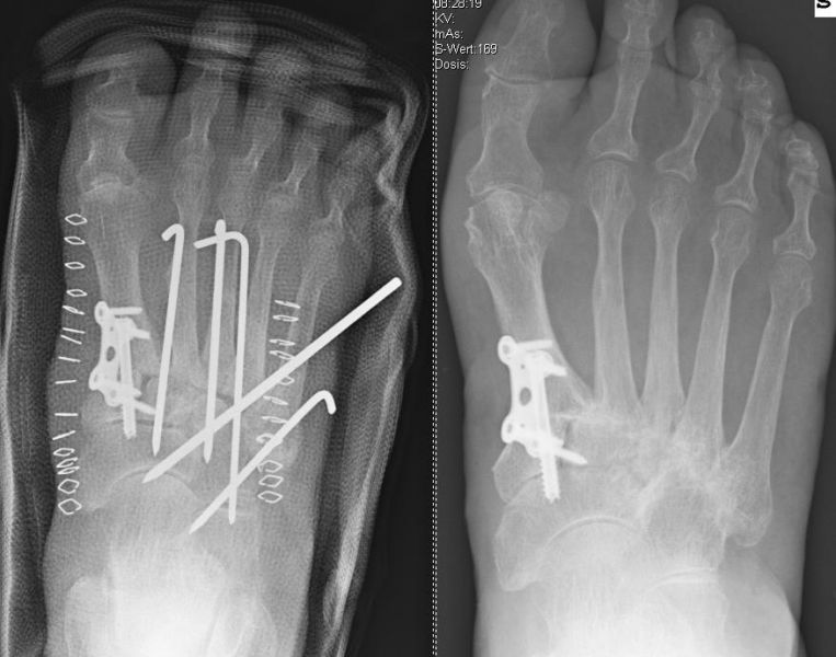 Chirurgische Eingriffe beinhalten die Arthrodesen der betroffenen Mittelfußgelenke. Tendenziell werden heute die betroffenen Gelenke isoliert versteift. Das Ziel einer Operation ist, durch eine anatomisch ausgerichtete stabile Arthrodese eine Reduktion der Schmerzen mit Verbesserung der Fußfunktion zu erreichen. Dies gelingt am besten mit einer Wiederherstellung der gleichmäßigen Verteilung der gewichttragenden Last.