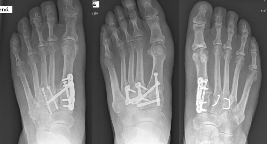 Grundsätzlich ist die Wiederherstellung der korrekten Anatomie mittels einer stabilen knöchernen Fusion das Ziel jeder Arthrodese. Hier ist neben sehr guten anatomischen und biomechanischen Kenntnissen, ein intraoperativer Röntgen-Bildwandler essentiell. Eine intraoperative 3D-Röntgen-Bildgebung und auch eine intraoperative Pedobarografie können hilfreich sein 1920.