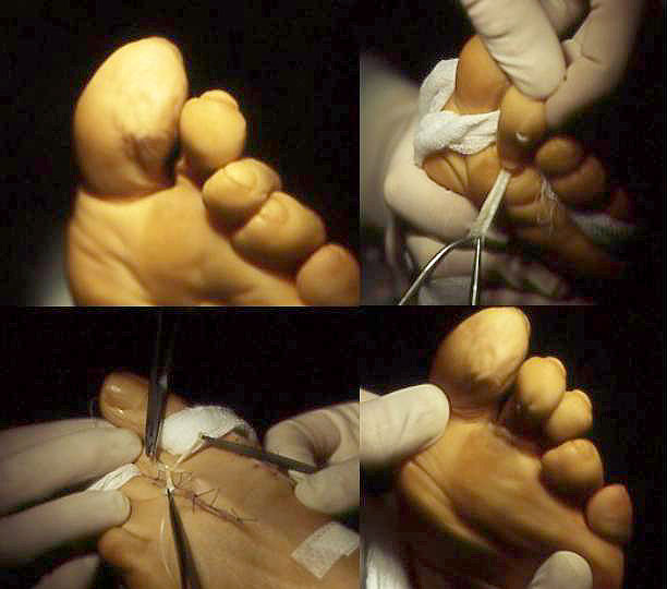 Sodann wird das Grundglied von dorsal ausgehend um die tibiale Seite nach plantar herumführend mit der Sehne umschlungen und selbige unter dem Grundglied hindurch nach fibular geführt. Nach Anlage eines Kapselrelease zur Entspannung der kontrakten Zehengrundgelenkkapsel wird die lange Strecksehne in Korrekturstellung der Zehe mit der Sehne des M. abductor digiti minimi vernäht.