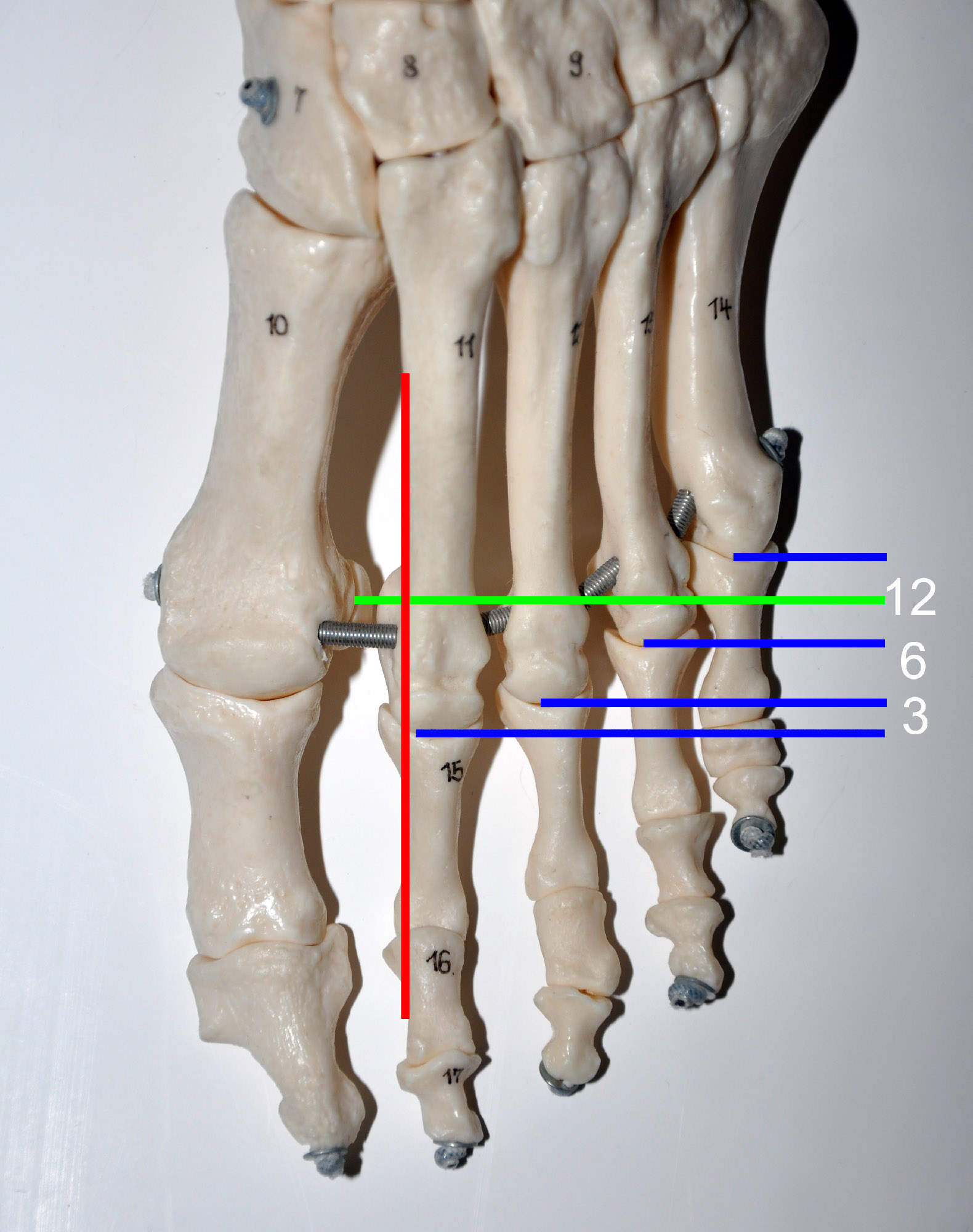 Von Barouk wurde unter der Prämisse einer gelenkerhaltenden Vorgehensweise in Europa die nach Weil benannte Metatarsaleköpfchenverschiebeosteotomie eingeführt 4. Ziel ist hierbei eine dosierte Rückkürzung der Länge des Mittelfußknochens (Abbildung 4). Wurde anfangs der breite Einsatz der Operation auch beim Beschwerdebild der Metatarsalgie unter der Zielsetzung einer Harmonisierung des Vorfußalignements empfohlen, so hat sich mittlerweile unter dem Eindruck durchaus auch kritischer Ergebnisse als Hauptindikation die Krallenzehe herauskristallisiert. Hierfür ist neben methodischen Fragen, welches Vorfußalignement anzustreben ist - genannt seien nur die unterschiedlichen voneinander abweichenden Metatarsaleindices (Abbildung 5 und 6) nach Maestro und Pisani 5 – vor allem die nicht selten zu beobachtende postoperative Bewegungseinschränkung im Zehengrundgelenk mit teilweise fehlendem Bodenkontakt der Zehenbeere verantwortlich. Dies wird zum einen der Narbenbildung, zum andern der Rückverlagerung des Insertionspunktes der intrinsischen Muskulatur geschuldet.