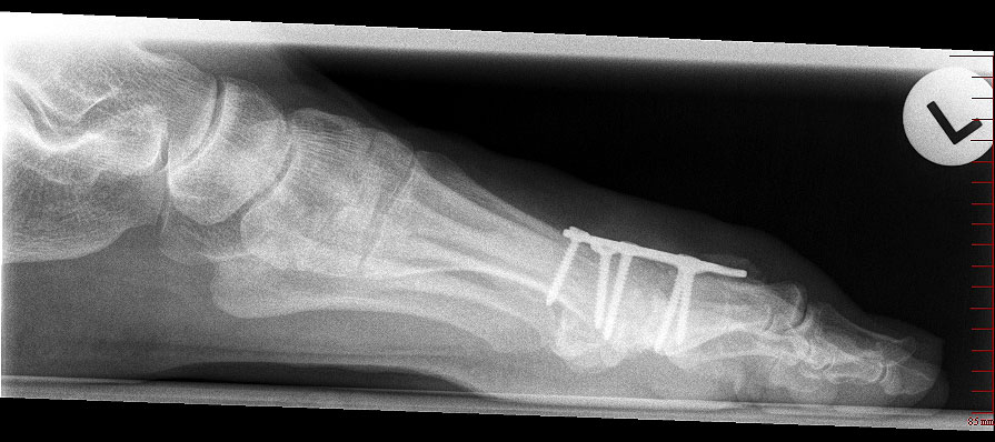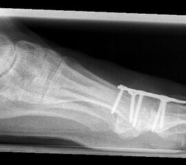 Entscheidend ist die korrekte Einstellung der Arthrodese und sichere Osteosynthese. Gekreuzt eingebrachte Schrauben werden immer noch als kostengünstige Standardtechnik der Osteosynthese beschrieben und können bei kräftigen und stabilen Knochenverhältnissen und entsprechender Erfahrung prinzipiell verwendet werden 141516. Der Einsatz kanülierter Schrauben unter Durchleuchtung erleichtert die Operation. Die Fixation mit mehreren Klammern (Stapels) ist zwar schnell und einfach in der Handhabung, bietet aber nur eine verminderte Primärstabilität 1718.