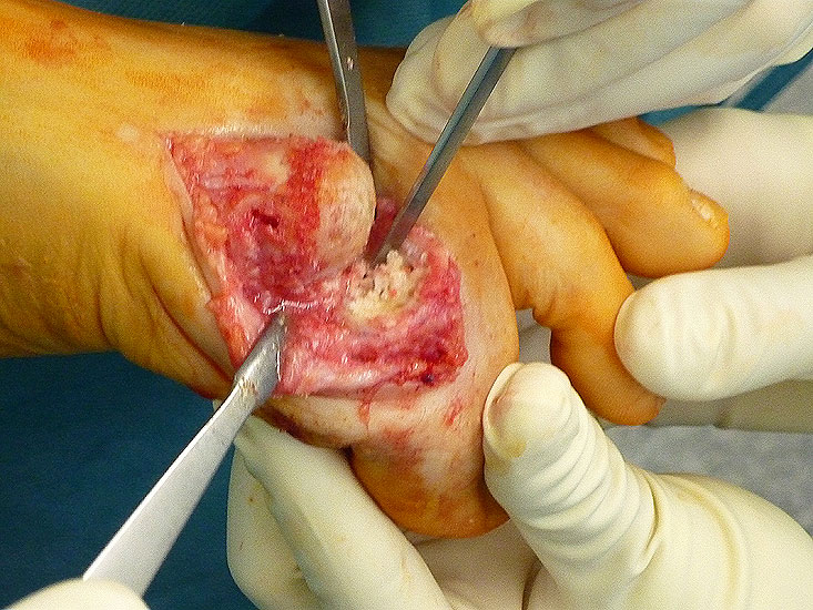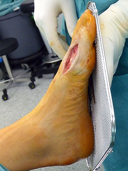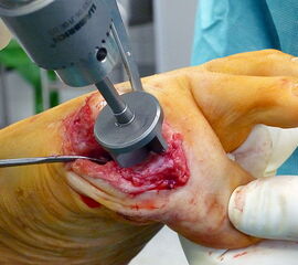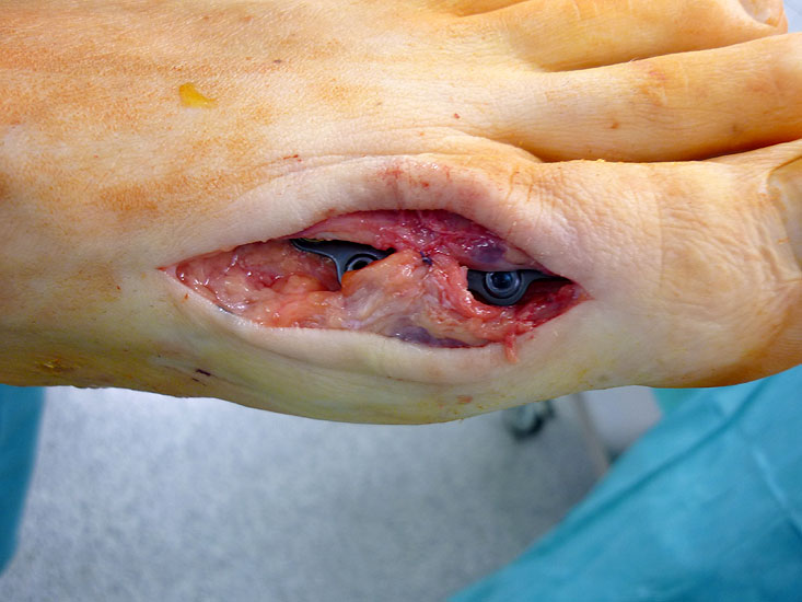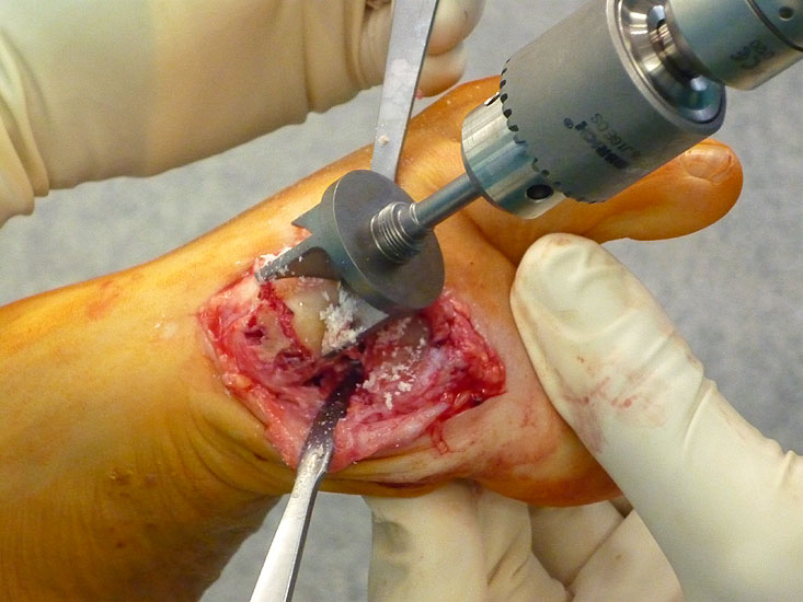 Das nachfolgend präsentierte OP-Verfahren zeigt die Großzehengrundgelenkarthrodese mit Gelenkflächenpräparation mittels sogennanter „Cup-and-Cone“-Fräsen und einer dorsal angebrachten variablen winkelstabilen Platte mit Gleit-/Kompressionsloch.