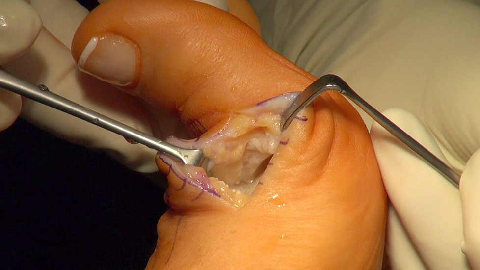 Die Cheilektomie ist indiziert vor allem im Stadium II der Erkrankung, in welchem die degenerativen Veränderungen vor allem auf die dorsalen Gelenkanteile konzentriert sind und sich in der plantaren Gelenkhälfte noch ein ausreichender Knorpelbelag findet 48. Der Eingriff umfasst die Synovektomie, die Entfernung von freien Gelenkkörpern und die Abtragung von dorsalen, lateralen und medialen Osteophyten am Metatarsale I Kopf und an der Grundgliedbasis. Zusätzlich kann eine offene Arthrolyse des Sesambeingleitlagers durchgeführt werden. Ziel ist eine Schmerzreduktion durch Abtragung der Ostepohyten mit Verbesserung der Beweglichkeit des 1. Metatarsophalangealgelenkes. Dieses Operationsverfahren kann auch im Stadium III der Erkrankung durchgeführt werden, allerdings ist dann häufiger mit Restbeschwerden und einer signifikant verlängerten Rehabilitationszeit zu rechnen 9.