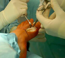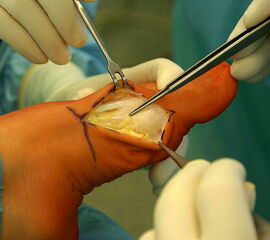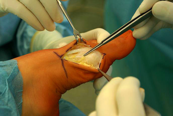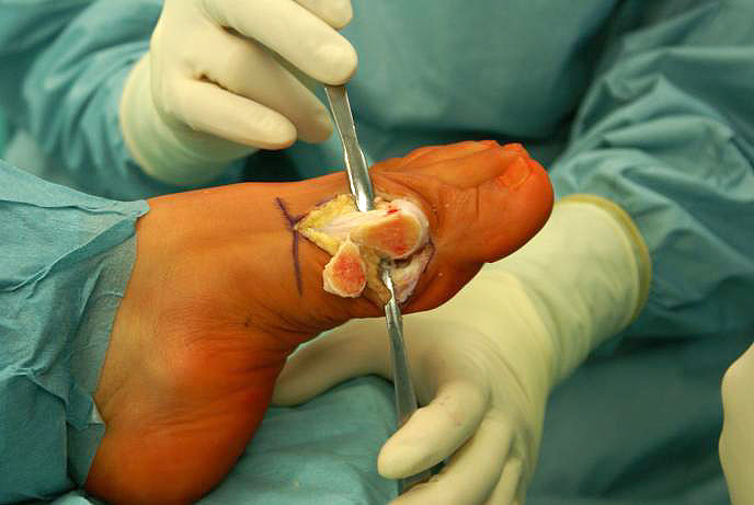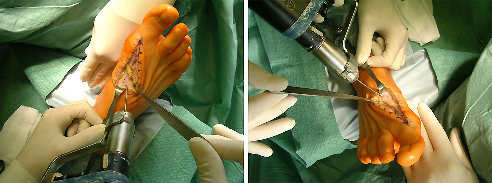 - Reposition des Großzehengrundgelenkes durch ein Release der lateralen Gelenkkapsel und Reposition des MT I über die Sesambeine, zusätzliche Lockerung der Sesambeinaufhängung.