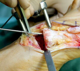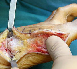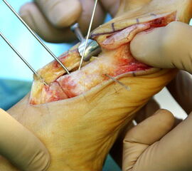 Kompromittierung oder postoperative Adhäsion der Flexor hallucis longus-Sehne, der Extensor hallucis longus-Sehne und der Abductor hallucis-Sehne.