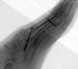 Direkt postoperativ Röntgenkontrolle (Fuß in zwei Ebenen). Sechs Wochen postoperative Röntgenverlaufskontrolle in zwei Ebenen im Stehen. Ist die Überbauung der Arthrodese nicht gut zu beurteilen, kann eine ergänzende 45° Supinationsaufnahme des Fußes angefertigt werden, die einen guten Einblick in das Tarsometatarsale-I-Gelenk ermöglicht.