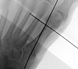Beurteilung des ersten Intermetatarsalwinkels (IMA), des Hallux valgus Winkels (HVA), des distalen (Distal Metatarsal Articular Angle, DMAA) und proximalen Gelenkflächenwinkels der Grundphalanx (Proximal Phalangeal Articular Angle, PPAA).