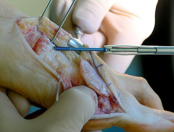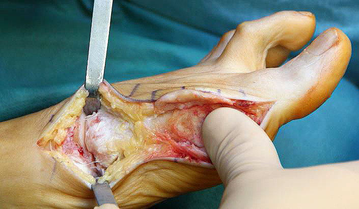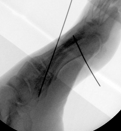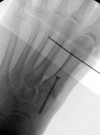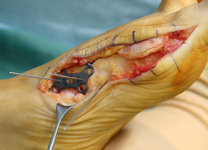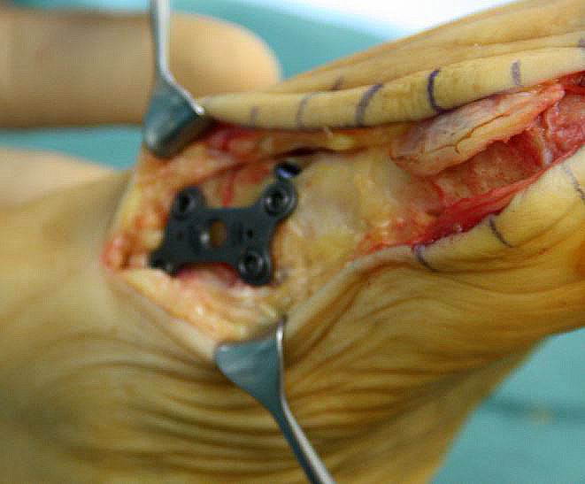 Es wird hier die Lapidusarthrodese mit Fixation durch eine medial angebrachte winkelstabile Platte in Kombination mit einer Zugschraube beschrieben 2. Durch diese Kombination läßt sich eine verglichen zur Schraubenosteosynthese hohe Primärstabilität erreichen, verbunden mit einem niedrigen Risiko einer Pseudarthrosenbildung 3.