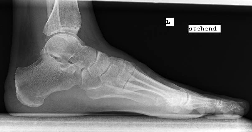 Röntgenaufnahme des Fußes im Stehen im dorsoplantaren und seitlichen Strahlengang (Abb. 1a-b).