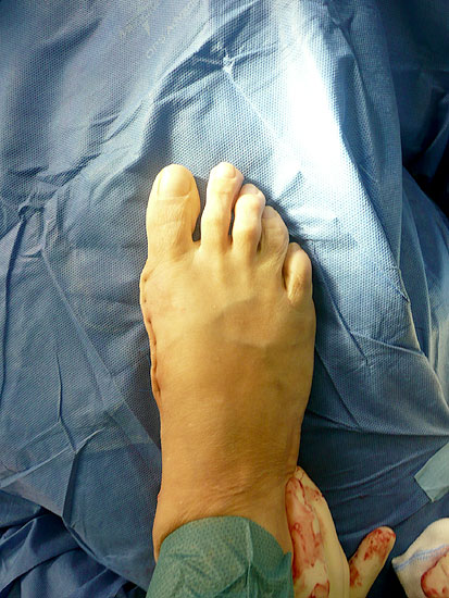 Nach Setzen einer Rotationsmarkierung wird nun das MT I unter Benutzen von weichteilschützenden Haken osteotomiert. Hierbei ist unbedingt zu beachten, dass in Abhängigkeit des Osteotomieverlaufes entweder eine Verlängerung oder sogar Verkürzung des MT I erzielbar ist.