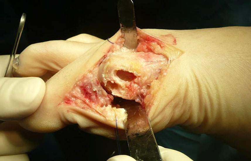 Nun hat die Resektion der medialen Pseudoexostose zu erfolgen. Die Resektion ist von distal nach proximal durch zu führen. Bei der Resektion sollte unbedingt die Gleitrinne des medialen Sesambeines geschont werden. Nicht selten zeigen sich Zysten im MT I- Köpfchen, welche jetzt kürettiert werden sollten. Bei großen Zysten kann jetzt Spongiosa aus dem Resektat in die Zyste eingefüllt werden.
