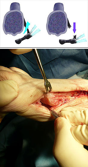 Das laterale Release der Sesambeinaufhängung kann jetzt entweder unter Sicht transartikulär mit einem Mini-Skalpell vorgenommen werden. Alternativ wird das laterale Release über einen zweiten Schnitt von dorso-lateral über dem MTP I durchgeführt.