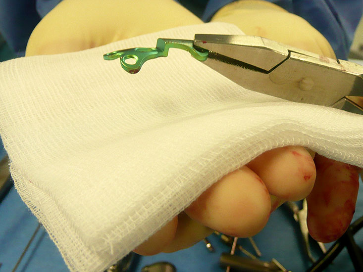 Bei Entnahme eines lateralen Keiles in der Osteotomie empfiehlt sich das Vorbiegen der Platte um einen Korrekturverlust zu vermeiden. Je nach Größe des Keiles muß das Ausmaß des Vorbiegens gewählt werden!