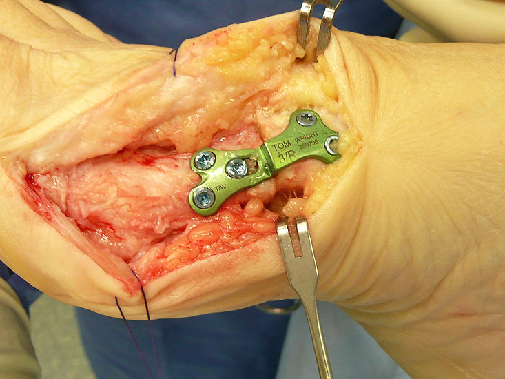 Hierbei ist zu beachten, dass die zuführenden Gefäße zum MT I- Köpfchen nicht verletzt werden, ebenso sollte die Kapsel am Grundglied nicht mehr als 0,5 cm nach cranial und caudal abpräpariert werden. In ca 35% der Fälle findet sich ein schalenförmiger medialer Meniscus, welcher exzidiert werden sollte 19.