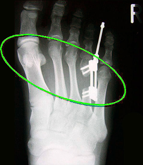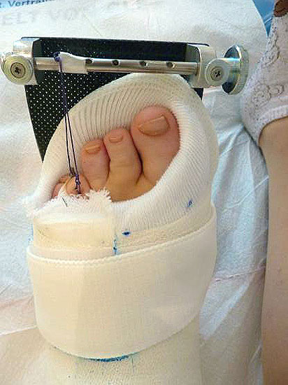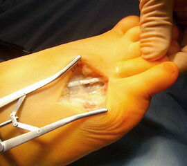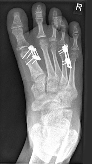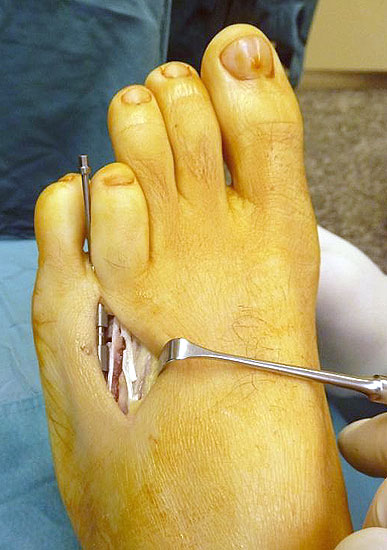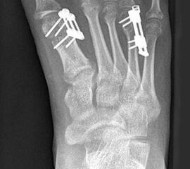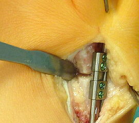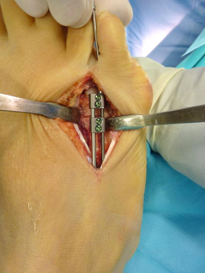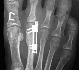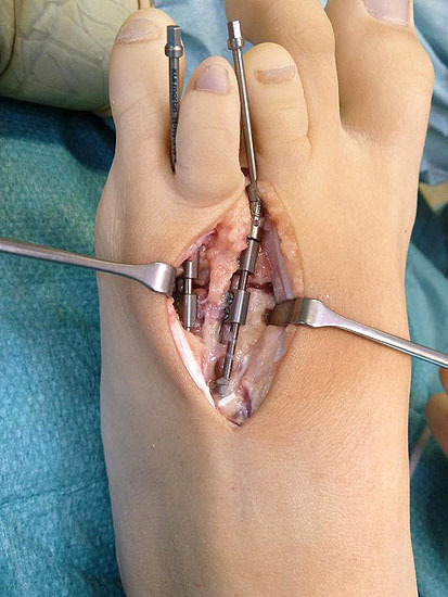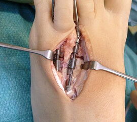 - Dritter Eingriff: Materialentfernung (Minifixateur interne) bei vollständiger knöcherner Durchbauung, hierbei ist in seltenen Fällen eine Lösung von Verklebungen der Strecksehnen und des Metatarsophalangealgelenks erforderlich.
