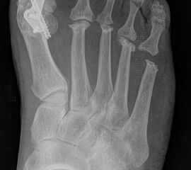 Mobilisation des Patienten im flachen Verband-Schuh für 4-6 Wochen. Die Dauer richtet sich nach der Therapie im Bereich des ersten Strahls.