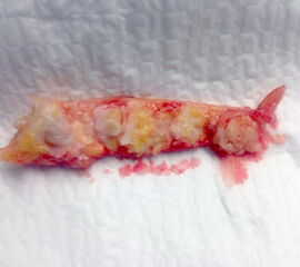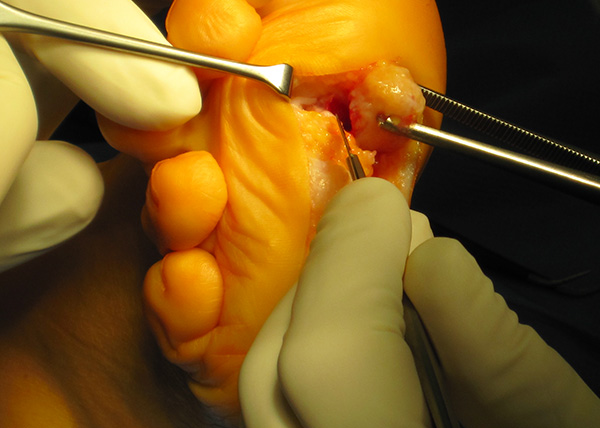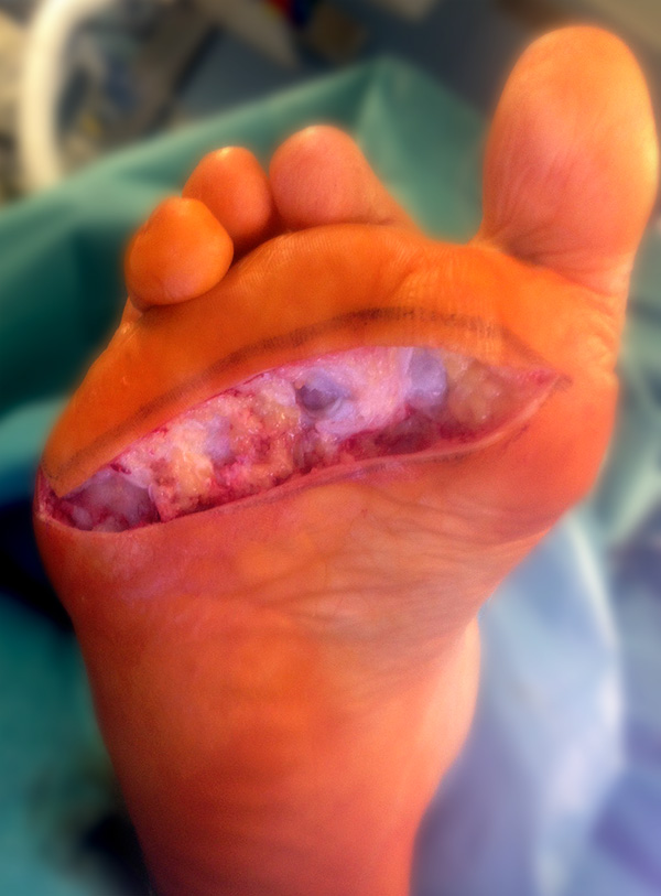Entfernung von Rheumaknoten und Bursen plantar sowie Reposition des nach distal dislozierten plantaren Fettpolsters durch die Dermatodese.