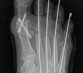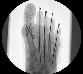Anleitung des Patienten in der Pflege der K-Drähte, Verbandswechsel und gegebenenfalls Zehen zügeln.
