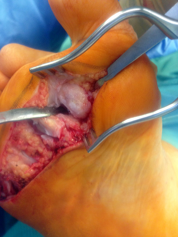 Teilweise ist dazu die Tenotomie der kontrakten Interosseussehnen notwendig. Meist müssen verklebte Strukturen mit dem Mc Glamry Elevatorium gelöst werden. Zum Schutz der Weichteile werden die Metatarsalia knapp proximal der Köpfe mit Hohmann Hebeln umfahren.