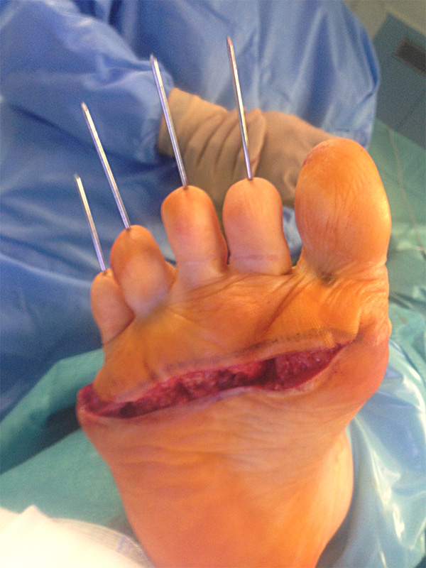 Abschließend erfolgt die temporäre K-Daht Fixation sämtlicher Kleinzehen in achsgerechter Stellung. Die Strecksehnen werden in Verlängerung vernäht.