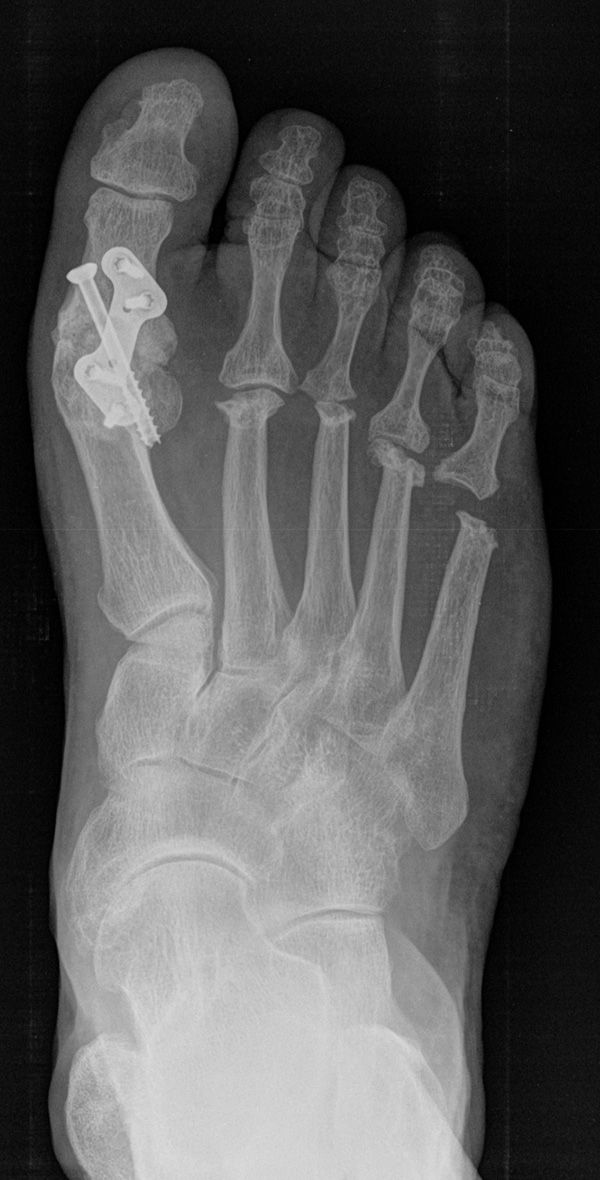 Die Arthrodese des Großzehengrundgelenks in Kombination mit einer Resektionsarthroplastik der Metatarsaleköpfchen der Kleinzehen führt zu guten klinischen Langzeitergebnissen bei Patienten mit rheumatoider Arthritis und destruiertem Metatarsaleköpfchen 34. Auch aktuelle Metaanalysen zeigen, dass dieses Verfahren den Standard bei dieser Pathologie darstellt und dass sich insbesondere auch gelenkerhaltende Therapieverfahren an diesen Ergebnissen messen müssen 35. Triolo et al. 11 berichteten über die Ergebnisse von 89 Füßen (62 Patienten) mit einem Follow up von mindestens 4 Jahren. Der AOFAS Score verbesserte sich nach Arthrodese am Großzehengrundgelenk und OP nach Tillmann Metatarsale II-V von präoperativ 33,4 ±16 auf 82,9 ± 11,9 Punkte. Schlechte Ergebnisse wurden beobachtet bei Patienten mit Revisionseingriffen aufgrund von Pseudarthrosen, verzögerter Knochenheilung, ungenügender Knochenresektion der Metatarsalia und störendem Osteosynthesematerial. Hulse et al. 36 verglichen die Ergebnisse nach Tillmann OP mit und ohne gleichzeitiger Resektion des Metatarsale I Kopfes. 44% der Patienten bei welchen das Großzehengrundgelenk erhalten wurde benötigten im 5-Jahres Follow-up einen weiteren Eingriff an diesem Gelenk. Die Autoren empfahlen daher, das Großzehengrundgelenk in jedem Fall in das Therapiekonzept einzubeziehen. Eine Langzeit Kohortenstudie an 203 Patienten (370 Füße) mit einem Follow-up von 11,4 Jahren wurde von Jüsten et al. veröffentlicht 10. 90,2% der Patienten berichteten über eine signifikante Besserung der Beschwerden, 87,5% über eine Besserung der Gehstrecke.