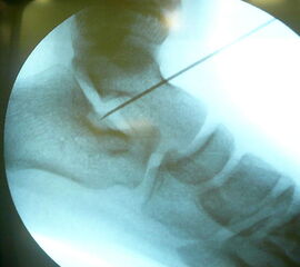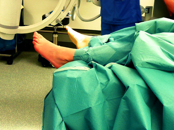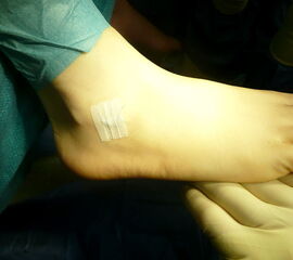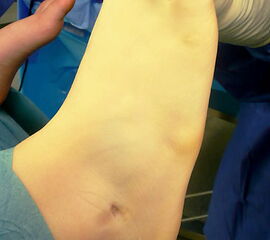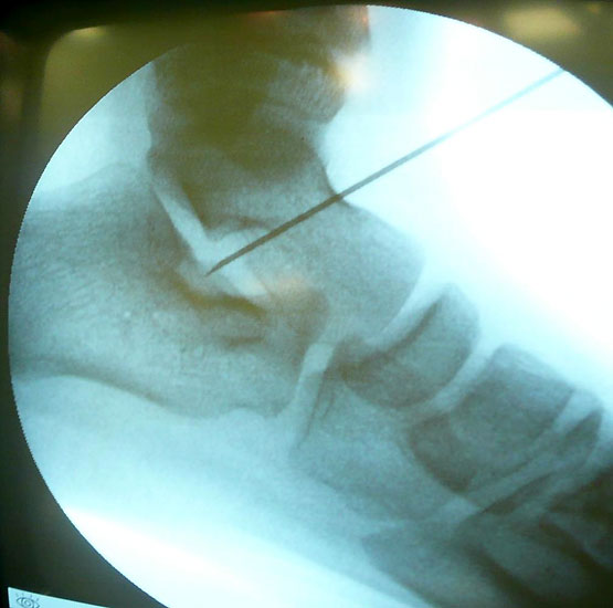 Abwaschen und steriles Abdecken beider Füße in Rückenlage und Unterschenkelblutleere (Abb. 1). Ertasten des Sinus Tarsi, zur genaueren Lokalisation Verwendung einer Kanüle (Abb. 2) um die korrekte Position über dem Eingang zum Sinus tarsi unter Bildverstärker zu kontrollieren. Über einen 1-2cm messenden Hautschnitt (Abb. 3) erfolgt nun die Präparation des Eingangs zum Sinus tarsi durch stumpfe Präparation. Die Knochenoberfläche des Calcaneus am tiefsten Punkt des Sinus tarsi wird dargestellt, unterstützt durch eine manuelle Rückfußinversion. Nach Markieren der korrekten Eintrittstelle mit einem Kirschnerdraht und anschließender Bildwandlerkontrolle (Abb. 4) wird nun die calcaneare Eintrittstelle in ca 20° Kippung nach lateral und dorsal mit einem 3,2mm Bohrer aufgebohrt.