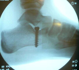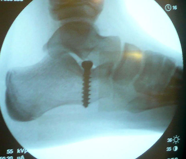 Hierbei ist darauf zu achten, einerseits den Eintrittspunkt nicht zu weit lateral zu wählen um eine Aussprengung der lateralen Calcaneus-Corticalis oder Kompromittierung der Peronealsehnen beim Bohren oder Eindrehen der Spongiosaschraube zu vermeiden, andererseits das Calcaneo-cuboidale Gelenk (C-C-Gelenk) nicht zu verletzen. Nach Gewindeschneiden und Längenmessen Einbringen einer 6,5 mm Titan-Spongiosaschraube mit durchgehendem Gewinde und einer Länge von durchschnittlich 25 bis 35mm. Der Abstand zum C-C Gelenk sollte mindestens 10 mm betragen.
