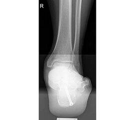 Komplikationen: In 1 Fall zeigte sich eine temporäre Läsion des Nervus suralis, welche jedoch nach 3 Monaten komplett ausgeheilt war. Es fanden sich keine Osteolysen, keine Schrauben- oder Dübelprobleme, keine Zystenbildung.