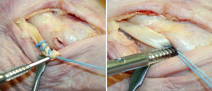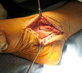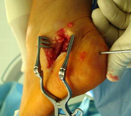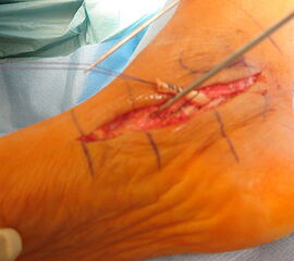 Alternativ können unterschiedliche Möglichkeiten zur Fixation der transferierten Sehne im Knochen gewählt werden (z.B. kann die Sehne durch ein Bohrloch im Os navikulare gezogen und mit sich vernäht werden) 6591011.
