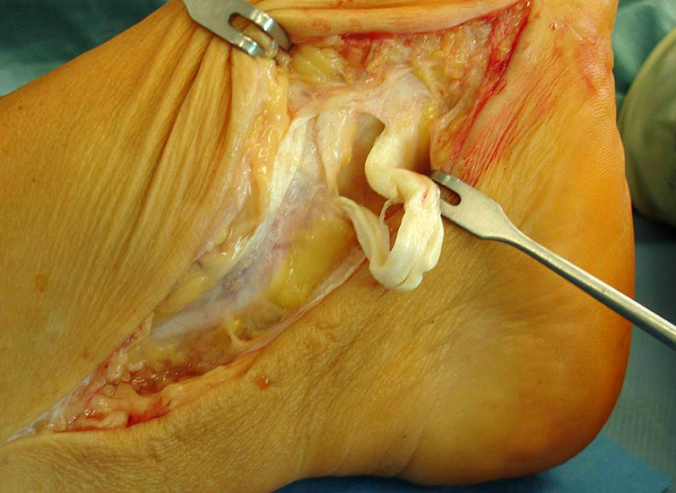 Intraoperativ wurden folgende Pathologien gefunden: Tendinopathien 33%, Teilrupturen 22%, Komplettrupturen 44%. In 75% der Fälle fanden sich zusätzlich Rupturen des „Spring ligaments“.