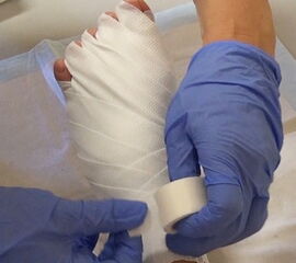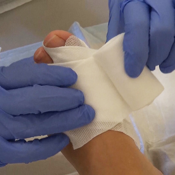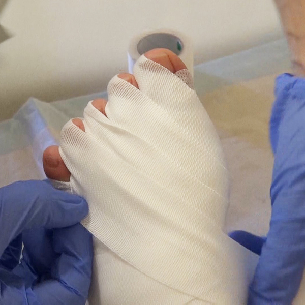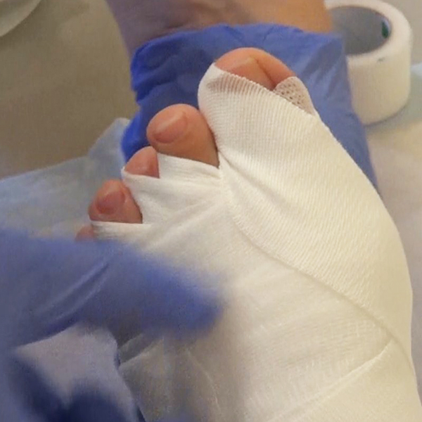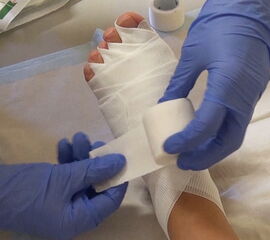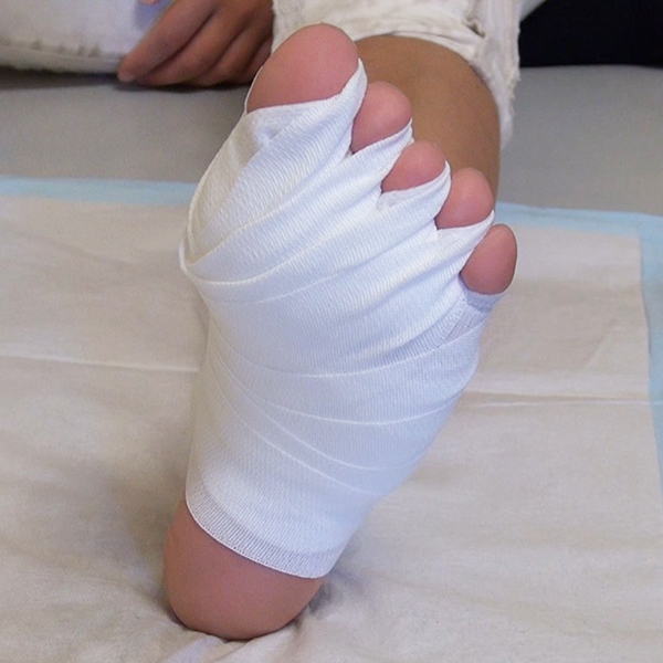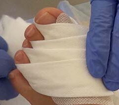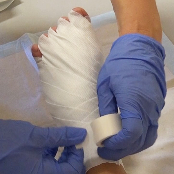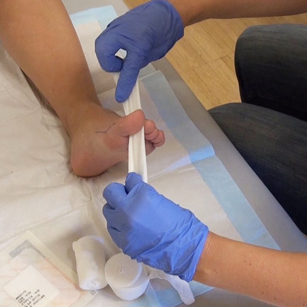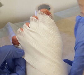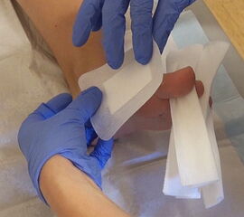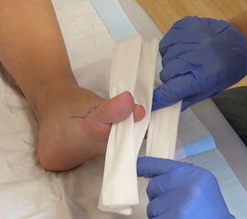 Der hier dargestellte Verband zeigt ein typisches Vorgehen nach Hallux valgus Korrektur. In Abhängigkeit von der vorliegenden Deformität sind möglicherweise Abweichungen von diesem Vorgehen notwendig.