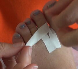 Wichtig: Nach minimalinvasiven Korrekturen der Kleinzehen kommt dem Tapeverband eine entscheidende Rolle zur Sicherung des Operationsergebnisses zu. Da keine zusätzlichen Drähte verwendet werden, führt ein vorzeitiges Entfernen möglicherweise zu einem schlechteren Behandlungsergebnis. Gleiches gilt, wenn die Zehe in einer Fehlstellung stabilisiert wird. Die Stellung der Zehe im Tapeverband sollte der Stellung entsprechen, die als finales Behandlungsergebnis gewünscht wird.